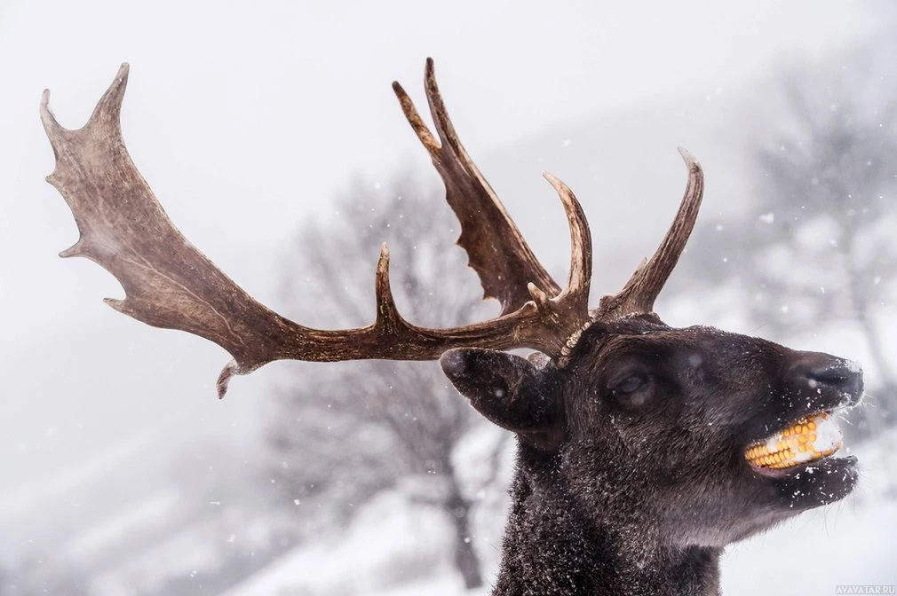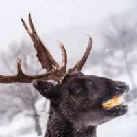 a dark coat with lighter-colored markings on its head and neck. Its eyes are wide open, looking directly at the camera, and its mouth is slightly agape as if caught mid-exhalation or perhaps expressing surprise or excitement due to the snowfall. The background is mostly white from the falling snow, indicating a cold,