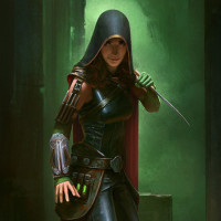 a female with a hood over her head. She is holding what looks like a knife in her hand, and the setting suggests she might be in a dimly lit or