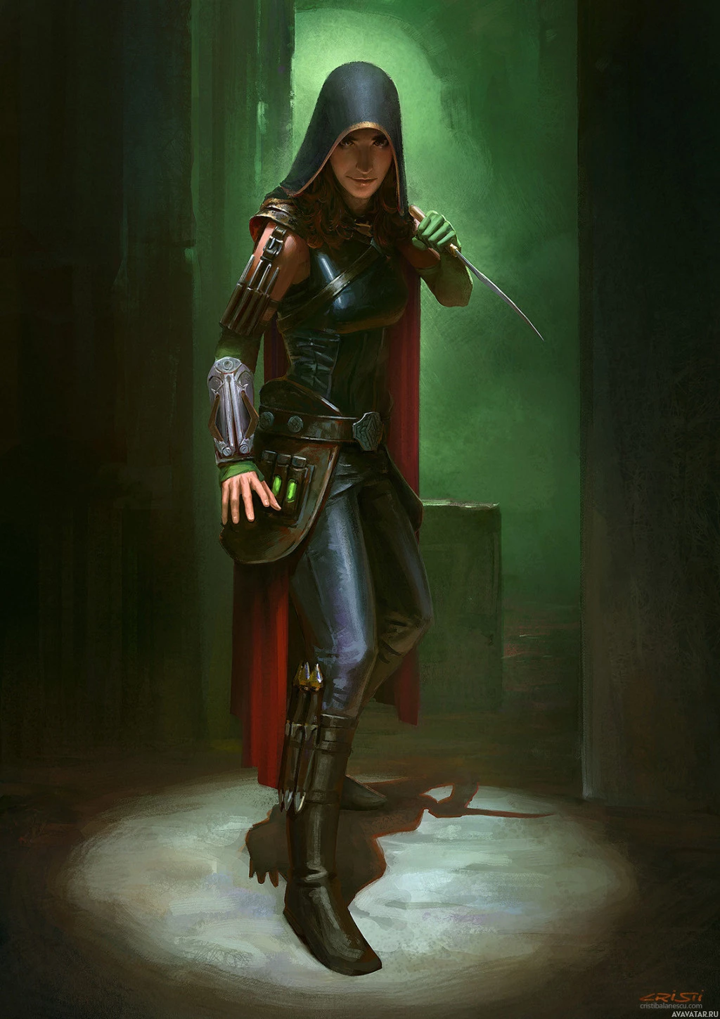 shadowy environment, possibly a dungeon or some other mysterious place. The character's attire includes elements that could indicate she has a role related to adventure or fantasy genres, as suggested by terms like "girl," "hood," and "knife." The art style is realistic with a touch of
