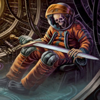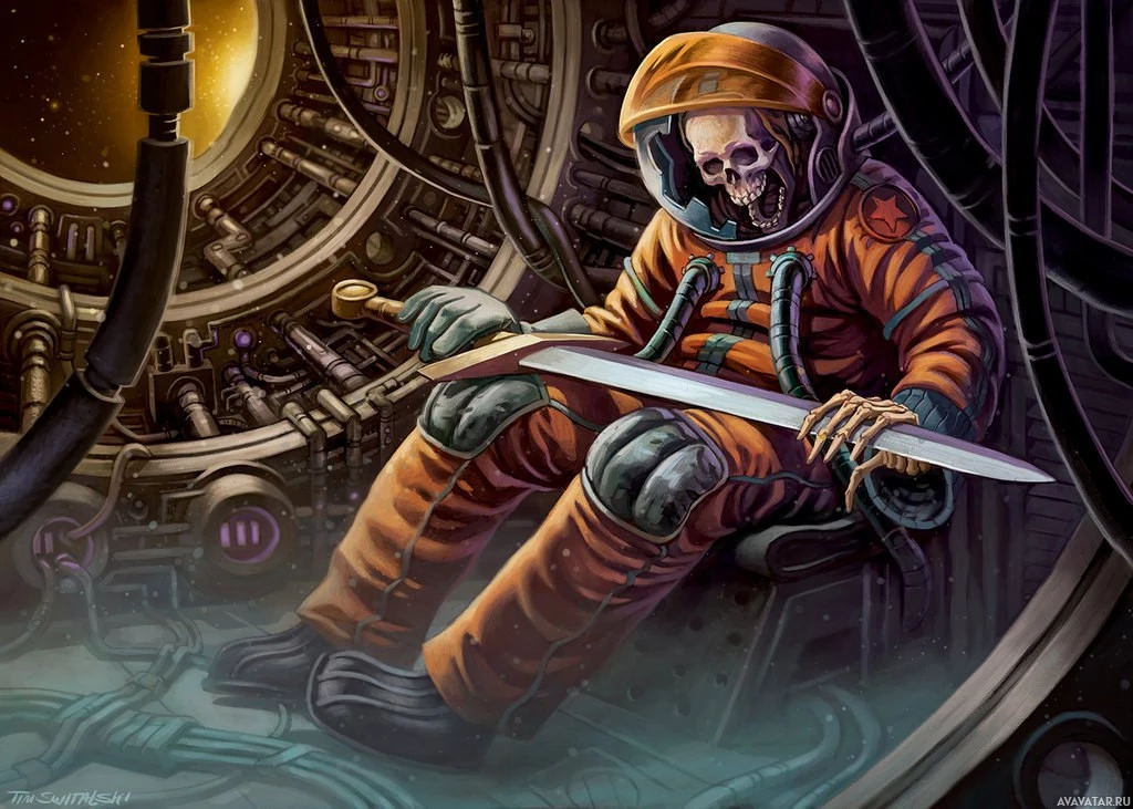 The image features a figure who appears to be an astronaut. The astronaut is depicted with the body of a skeleton, wearing traditional