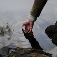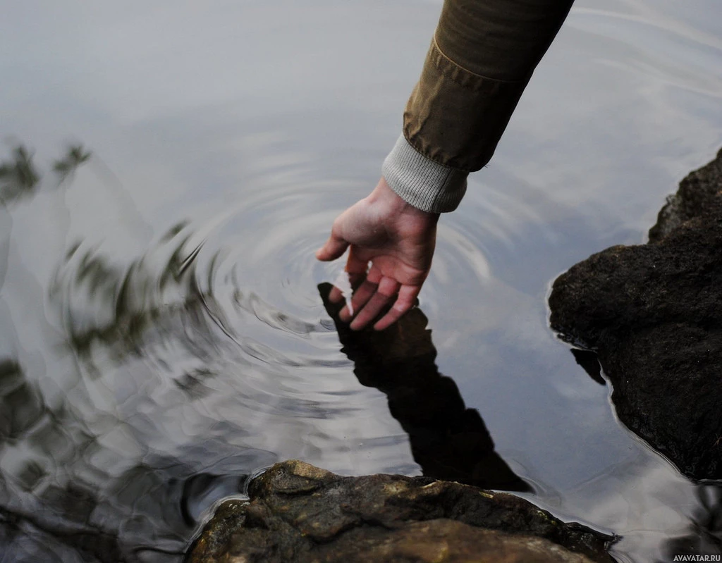 The image shows a hand extending into the water, which appears to be rippling. There is a reflection of the person's arm and hand on