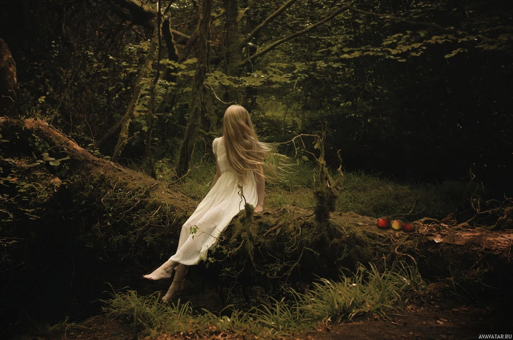 blonde hair and is wearing a white garment that could be a dress or robe. They are surrounded by greenery and it looks like a peaceful,