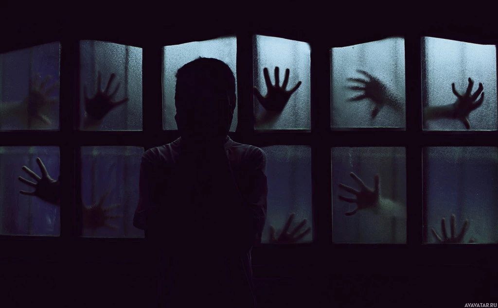 На картинке изображен силуэт человека, стоящего перед несколькими окнами, руки которого выходят из окон, создавая визуальный эффект, который предполагает, что несколько рук пытаются взаимодействовать или захватить внимание зрителя. Эта сцена имеет жуткую и, возможно, преследуемую тему из-за темноты и призрачного вида рук.