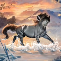 a flowing mane and tail, suggesting it may be a wild or mythical creature, such as a unicorn. A fairy is seen flying nearby with a wand in hand, adding to