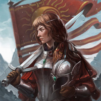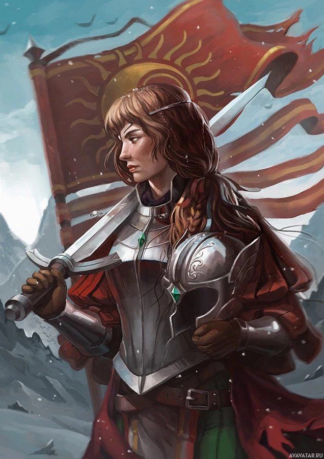 red hair, and her expression is focused as she looks into the distance. She's holding a sword in one hand and a flag with
