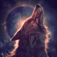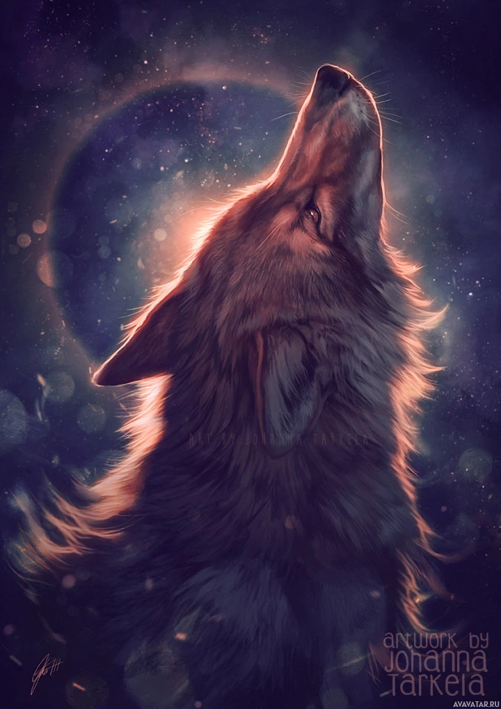 The image features a wolf depicted in a stylized and anthropomorphic manner. The wolf is shown with an upright posture, resembling that of a human, and it appears to be howling or singing into