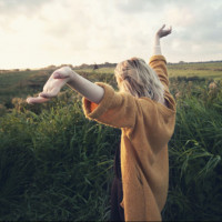the warm lighting. The individual is facing away from the camera, with their arms raised as if they are dancing or embracing nature. They have