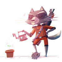 Rocket Raccoon, a popular Marvel superhero. This depiction is not directly from the comics or movies but rather an interpretation of the character's look and style in an illustration. The raccoon is standing upright like a human and is wearing