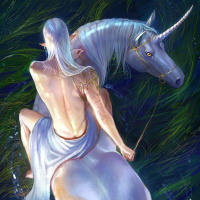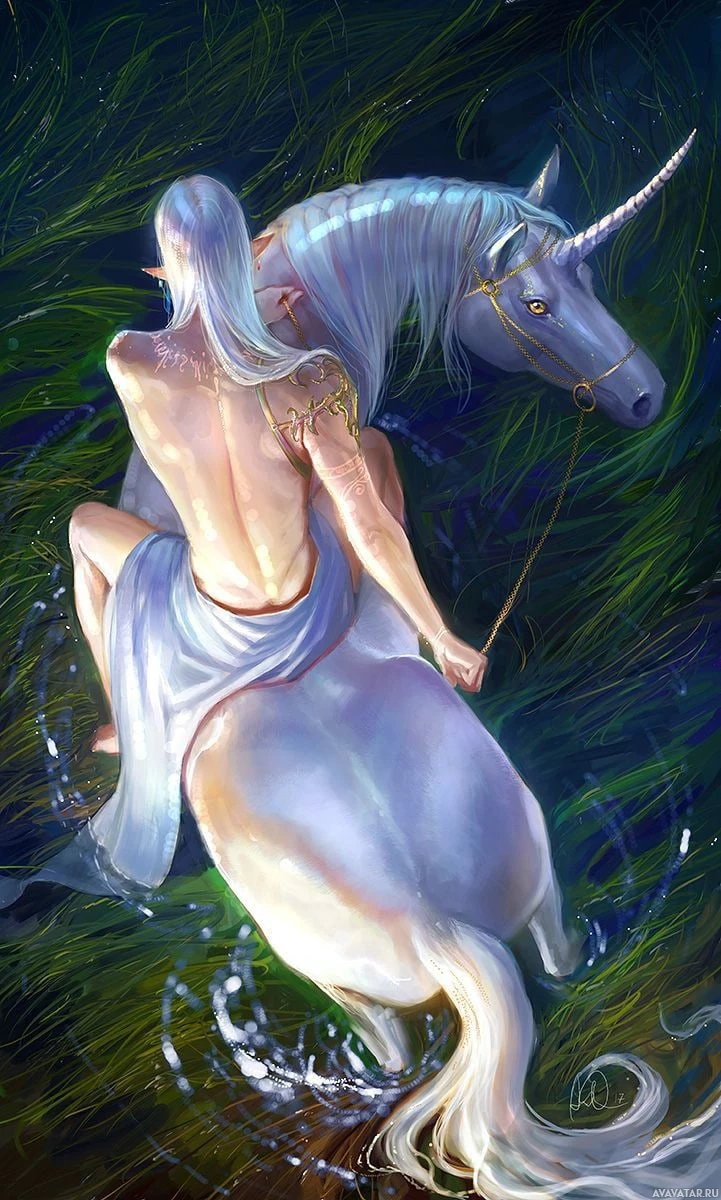The image depicts an elf riding a unicorn. The unicorn appears to be of