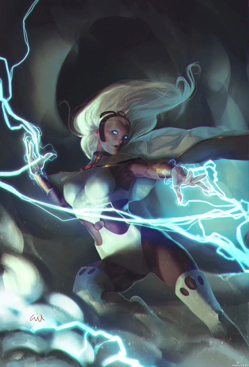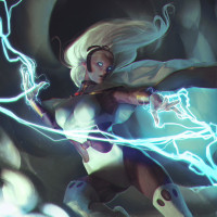 white hair, a purple and black costume, and she appears to be using her powers to generate electricity in the form of lightning bolts around her hand. Her pose suggests motion, as if she's attacking or defending against an enemy. The background is dark and cloudy, fitting the superhero theme often associated with these characters.