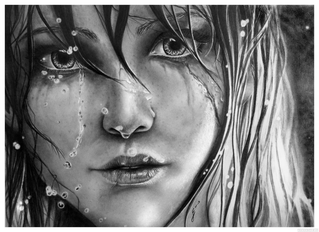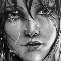 careful attention given to the details, such as the individual droplets that resemble teardrops around her face and in her eyes.