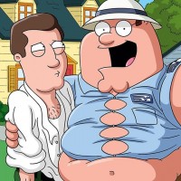mouthed smile on his face, as if he's excited or happy about something. Both characters are depicted in a cartoonish style typical of "Family Guy."