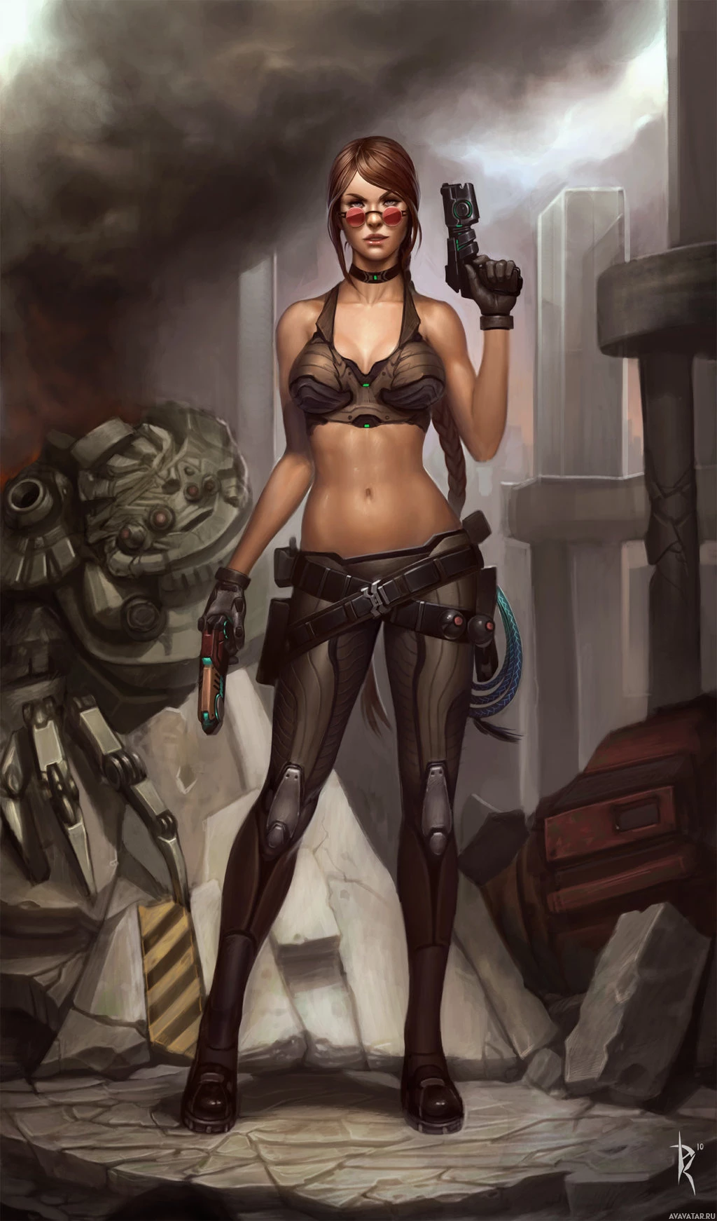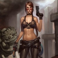 a tank top and combat boots, along with bikini bottoms visible underneath the top. In each hand, she holds what appears to be a pistol, suggesting that she is engaged in some form of combat or action scenario. The character's design could be reminiscent of Lara Croft from the "
