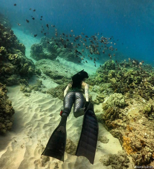 На снимке изображена женщина, ныряющая под воду. Она, кажется, носит гидрокостюм с русалкой, как хвост и лежит на спине на морском дне, в окружении кораллов и маленьких рыб, плавающих вокруг нее. Вода прозрачная, что указывает на хорошую видимость для дайвера.