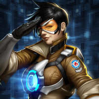 The image depicts an animated character resembling Tracer, a playable hero from