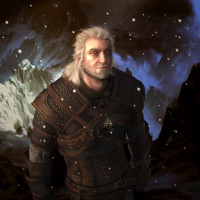 The image shows a character known as Geralt of Rivia from the video game "The Witcher 3: Wild Hunt." He is depicted in his armor, standing on what appears to be a snowy landscape with mountains in the background.