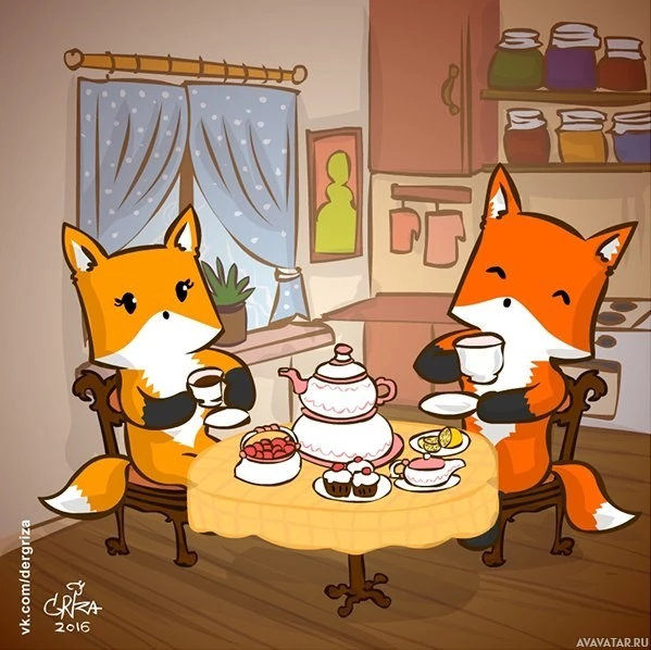 The image features two anthropomorphic fox characters sitting at a tea table with