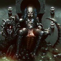 numerous skulls that give the impression of a grim and ominous environment. To Ripley's right stands the Predator, which is a humanoid alien from the "Predator" movie series known for its