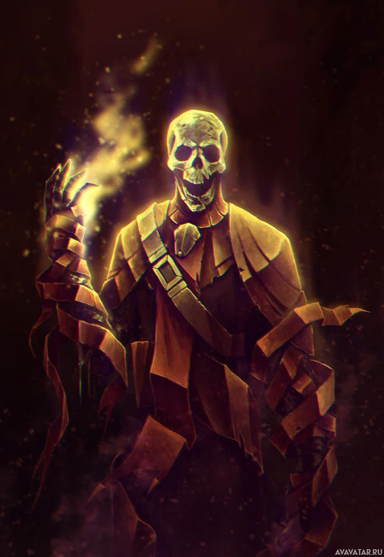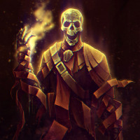 a fantastical character, which appears to be a skeleton wearing some sort of armor or costume. The background has a dark and mystical vibe, with what looks like flames or energy emanating from the character's hand, suggesting a theme related to magic or fire. This could be an artistic representation of