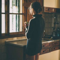 The image shows a person, who appears to be a woman, standing in a kitchen. She is wearing a dark-colored top and is looking out of a window with her back towards the camera. In her hands, she holds what seems to be a cup or container. The setting suggests a domestic scene, possibly