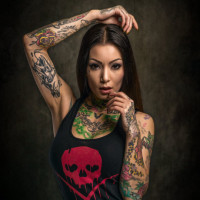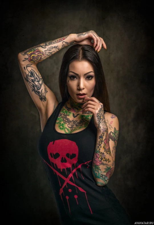 a person with tattoos, predominantly on their arms. They appear to be wearing