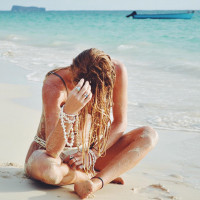 The image features a woman sitting on the beach. She is wearing a bikini and has