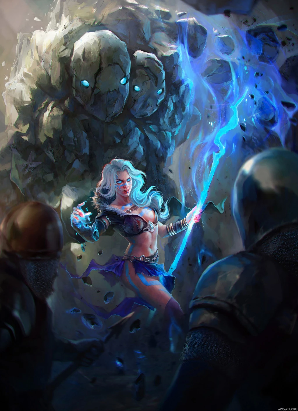 a blue light, which could imply that she is using magic or casting a spell. Behind her, there are rocks and what looks like