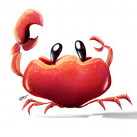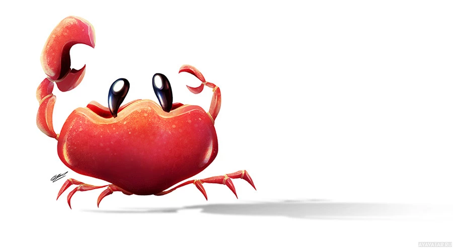 На картинке изображен анимированный краб. У него яркая красная оболочка с более темными красными отметинами, и он демонстрирует веселое выражение с широко открытыми глазами и когтями, поднятыми вверх, как будто он машет или приветствует кого-то. Фон простой белый, что контрастирует с красочным внешним видом краба.