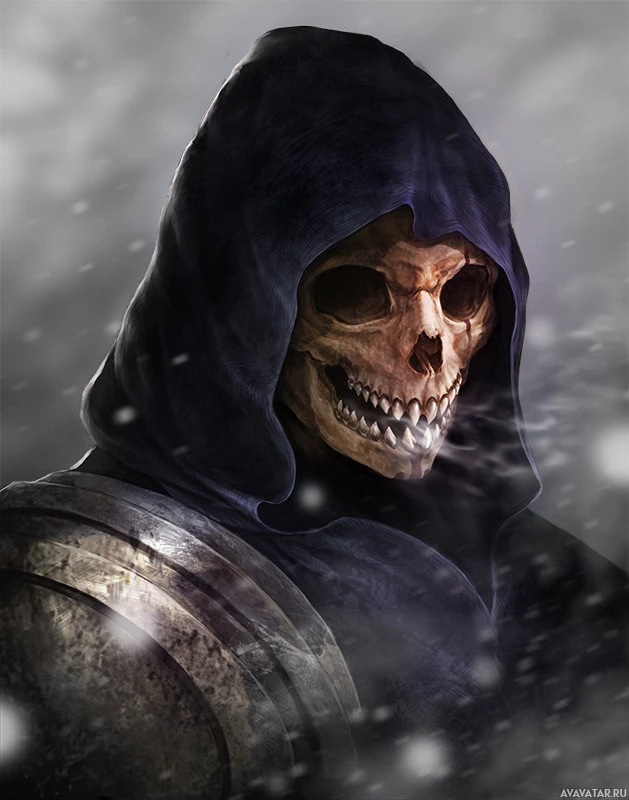 a skull for the head, which adds to its ominous appearance. It's wearing