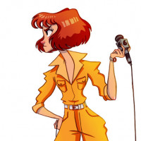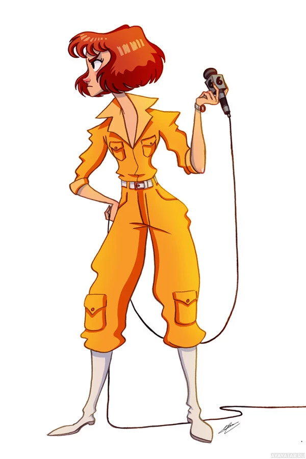 yellow jumpsuit and boots, suggesting a stylish or adventurous personality. In her hand, she holds a microphone with a cord attached to it, indicating that she might be involved in some form of broadcasting or public speaking event. The character's pose and the mic suggest she is actively engaging with an audience or preparing to do so.