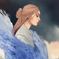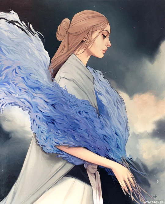 feathered garment or wings covers her back, adding to the otherworldly appearance. The character's expression is one of contemplation or peacefulness. The background suggests