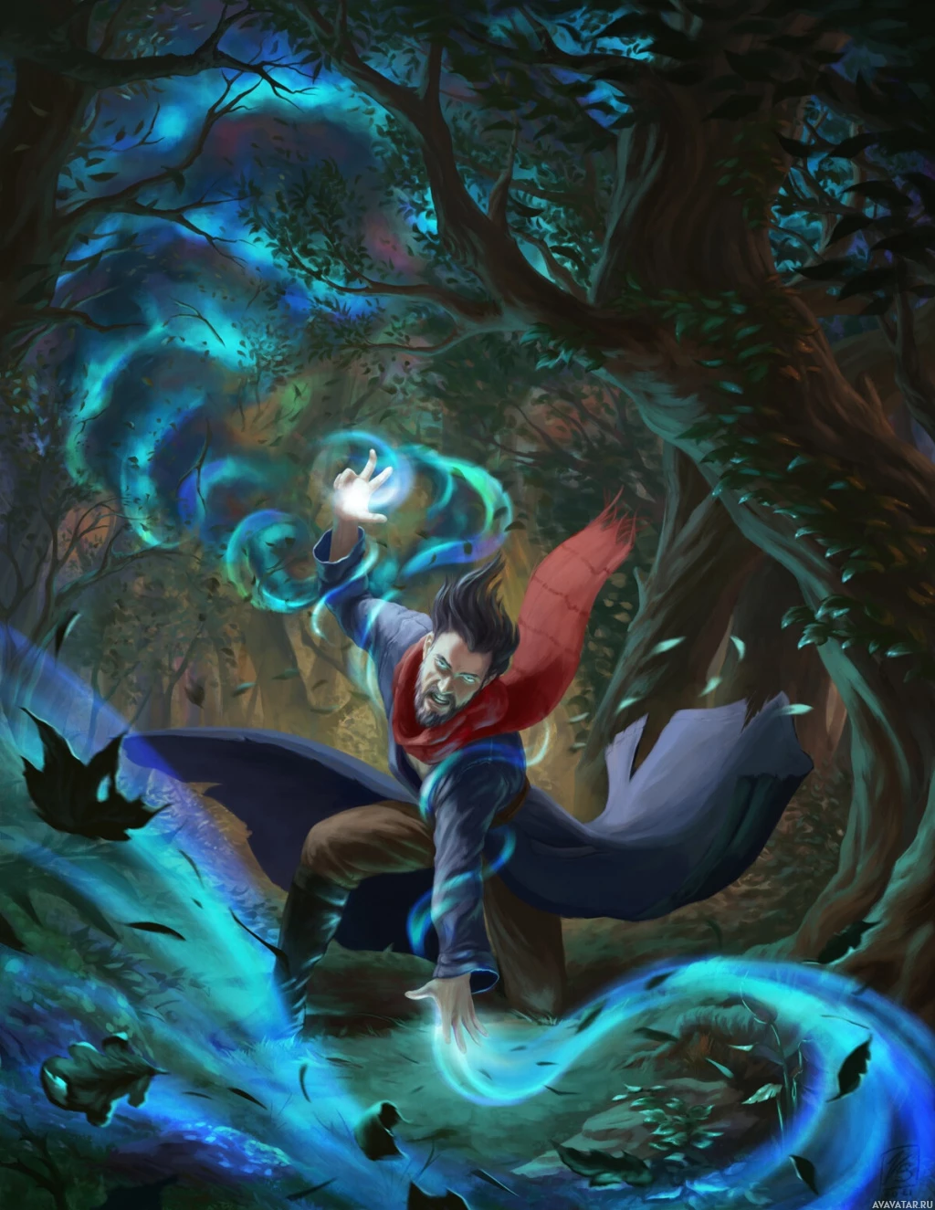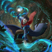 an enchanted forest with dark blue, green, and purple hues, creating a mystical atmosphere. There are magical elements like swirling blues and greens that suggest the presence of