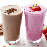 different types of milkshakes or smoothies. On the left, there is a chocolate-colored drink, possibly
