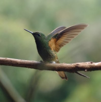 The image shows a hummingbird perched on a thin branch. Its wings are extended, and it appears to be in motion or preparing for flight. The background consists of greenery that suggests this scene is taking place in a forest or jungle environment.