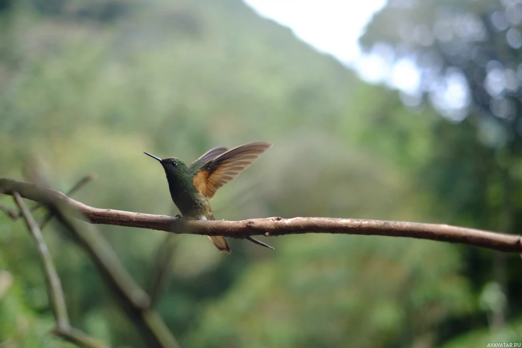 Картинка показывает колибри, сидящего на тонкой ветке. Его крылья вытянуты, и он, кажется, находится в движении или готовится к полету. Фон состоит из зелени, которая предполагает, что эта сцена происходит в лесу или джунглях.
