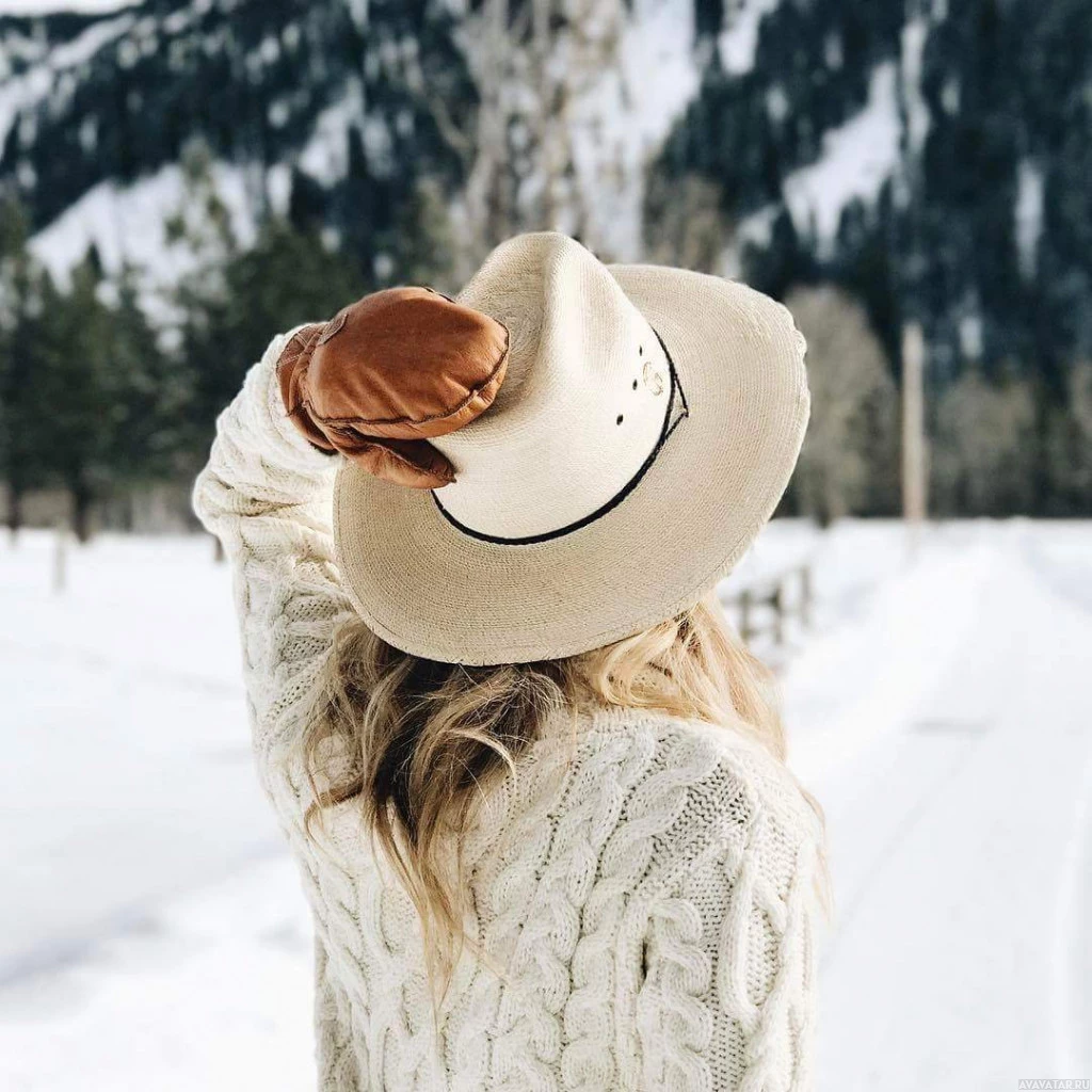 the brim of the hat with their hand. It appears to be a wintry day, as indicated by