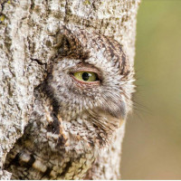 The image shows a close-up of an owl perched on a tree trunk. It has its head turned slightly to the side, giving it a curious or attentive look. This is a common pose for many bird species when they are alert and observing their surroundings.