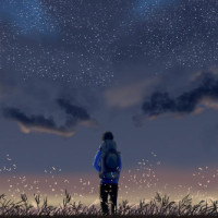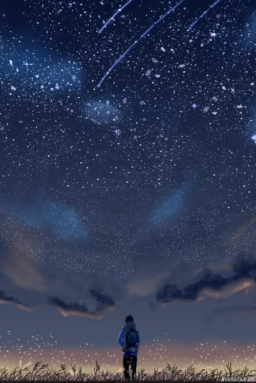a grassy field at night, with the sky filled with stars. There is a sense of solitude and tranquility as the person gazes upwards, possibly at the meteor shower or shooting stars that are visible against the dark canvas of