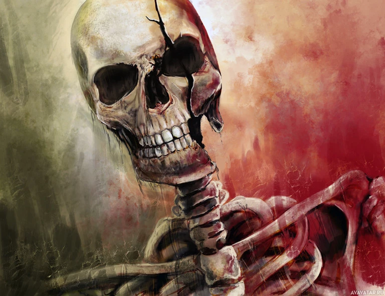 a human skull. The skull is prominently displayed with detailed muscle and bone structure, but the facial features are abstracted or obscured in ways that evoke