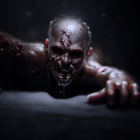 a crouched position with blood dripping from their mouth onto the ground. The setting is dimly lit, which contributes to the overall creepy and unsettling atmosphere of the image. It's designed to evoke fear or disgust typically associated with zombie