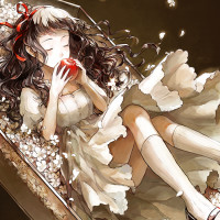 blossom petals. In her hands, she is holding what seems to be an apple, which could suggest that it's part of the theme or storyline depicted in this artwork. The character's expression and the context of being in a casket full of