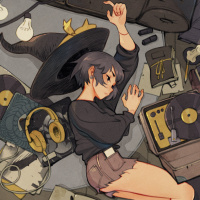 In the image, you see an illustration of a character who appears to be a witch. She is lying down among various items that suggest she might be engaged in some sort of