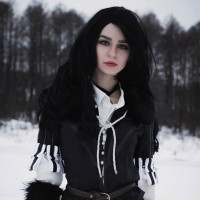 a cold setting possibly indicating that this photo was taken during the colder months. The clothing and makeup suggest a strong resemblance to Yennefer's