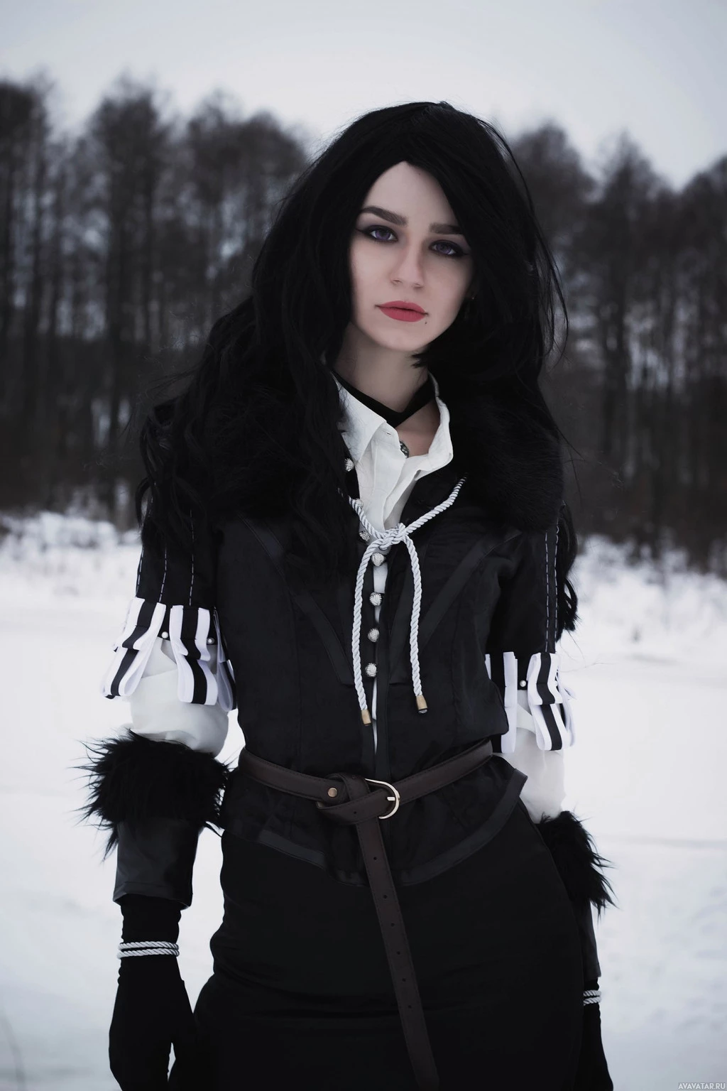 The image shows a person dressed in an outfit that resembles Yennefer from