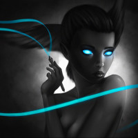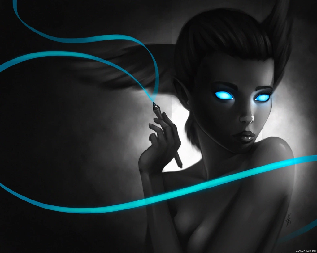 long hair and is adorned with blue jewelry or ornaments that add to the mystical appearance. Her skin tone is pale, which complements her dark, flowing hair and