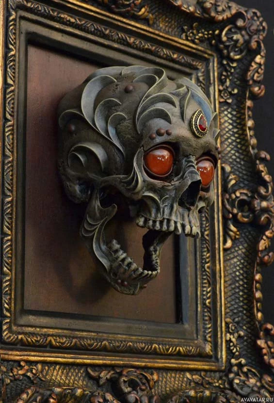 a decorative skull. It is an artistic representation that appears to be inspired by fantasy or horror genres, with the red and white details giving it an ominous or gothic appearance. The skull is positioned inside what looks like a frame or door with