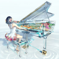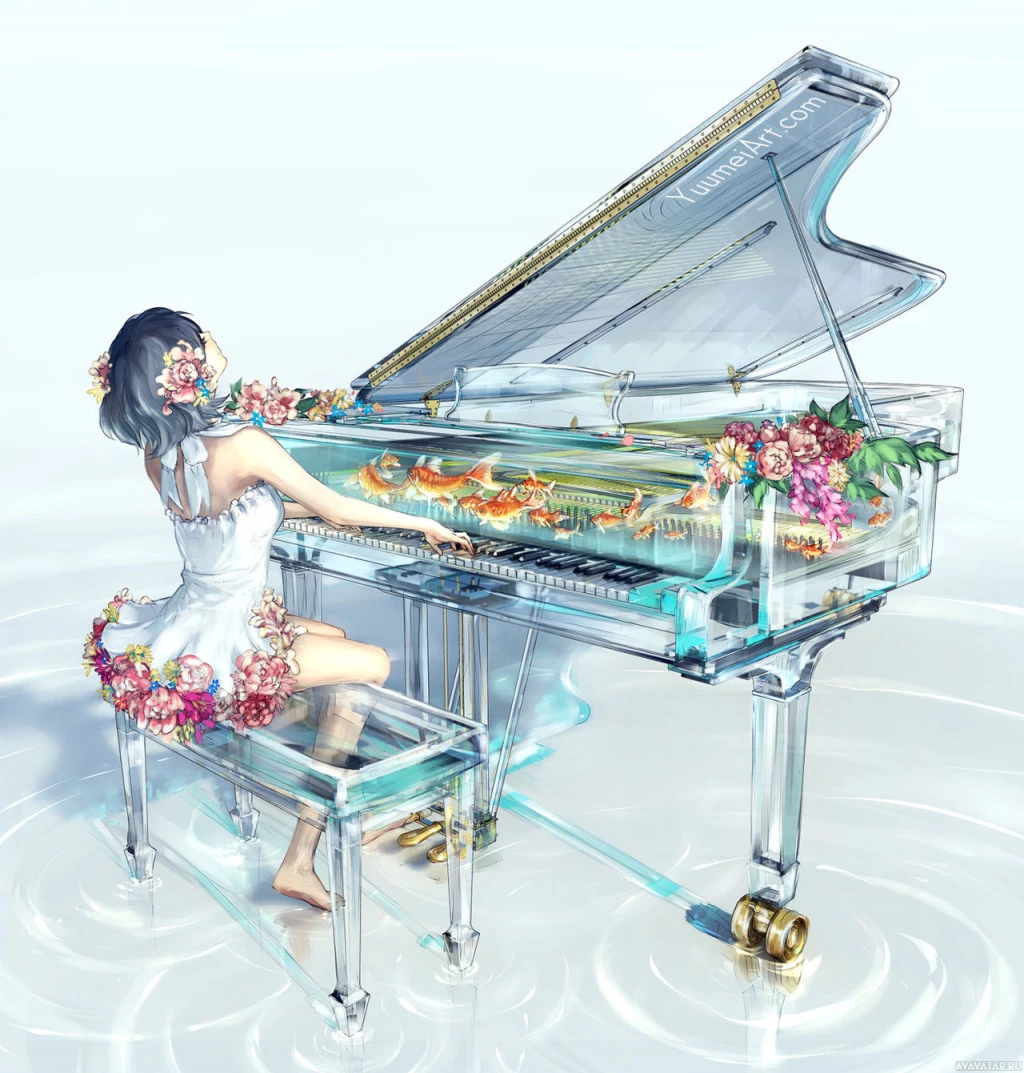an underwater piano. She is seated and appears to be engrossed in her performance. The piano is adorned with