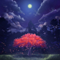 red flowers or blossoms, suggesting that it could be a cherry blossom tree. The presence of clouds and stars adds to