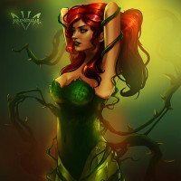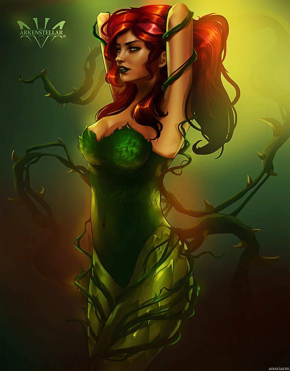 The image features an illustration of a character known as Poison Ivy, who is typically depicted with