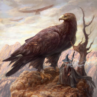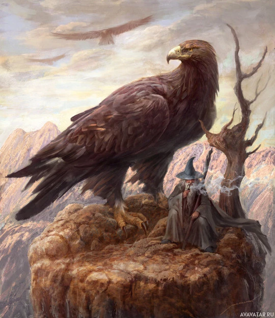 a fantasy scene, featuring what appears to be Middle-earth themed elements. A figure resembling Gandalf the wizard from J.R.R. Tolkien's works is present in the scene. An eagle, often associated with various mythological and